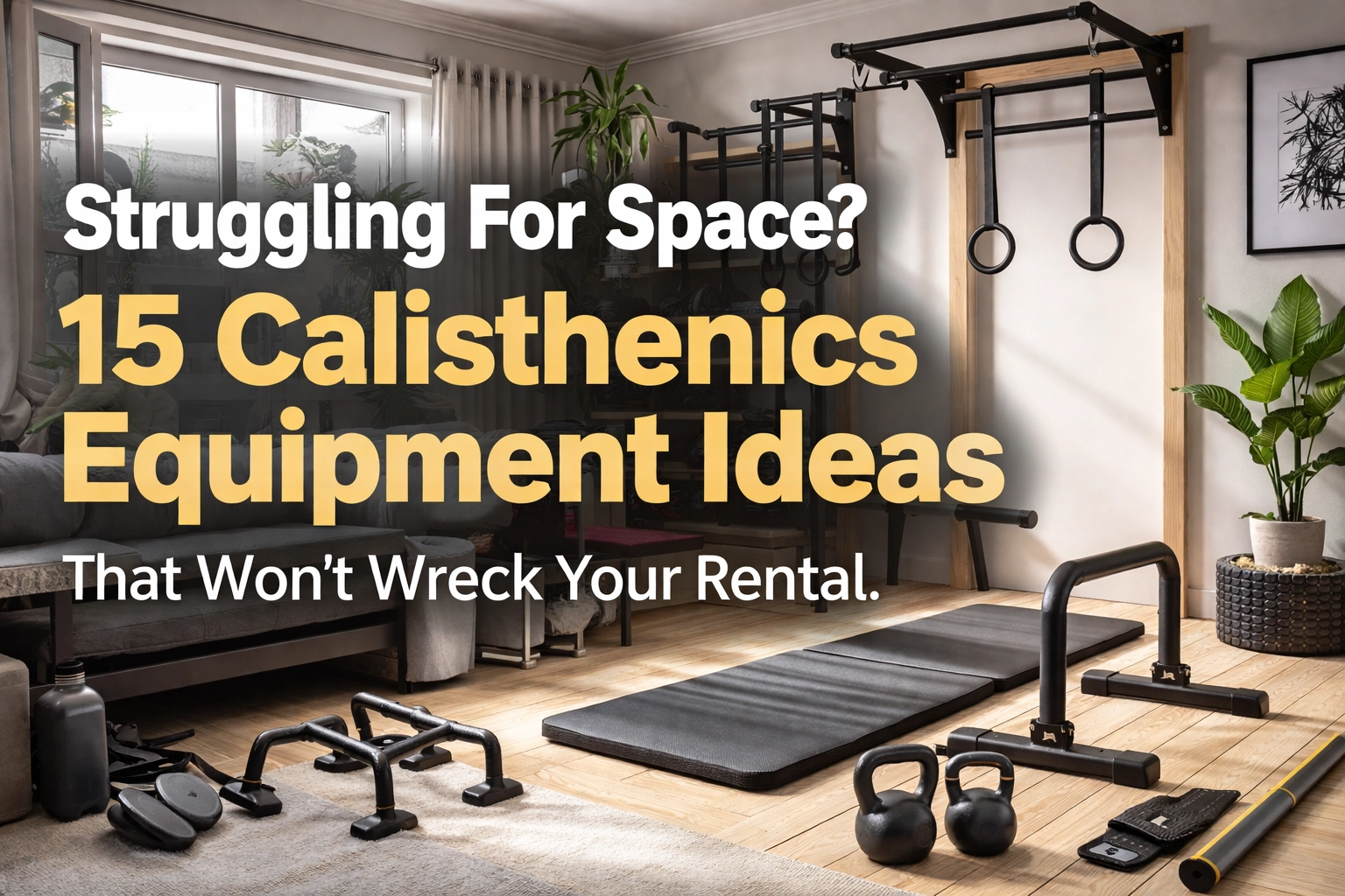 For most serious athletes, the ideal rental-friendly setup includes: a floor-to-ceiling system like the Resistance Rail Deluxe, gymnastic rings, a set of parallettes, resistance bands, and a quality mat. That combination covers pulling, pushing, core, and skill work without a single hole in your walls.