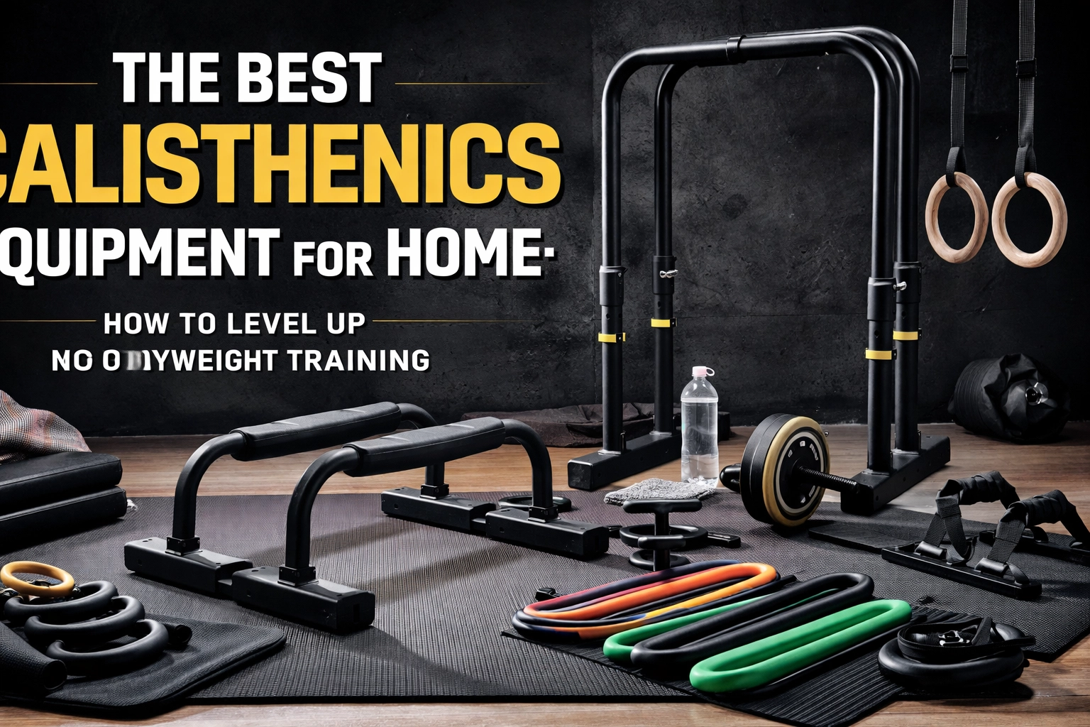 Flat-lay of calisthenics equipment including parallettes, resistance bands, mat, and dip belt for versatile home workouts